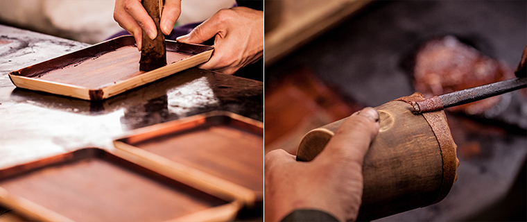 这个部分是底漆的制作,在轮岛涂中称为下地。虽然最后的成品看不出这一步骤,但轮岛涂之所以坚牢离不开这一关键的过程。首先木胎做好后,先用生漆擦拭一遍,可以起到防止木胎吸水变形的效果。